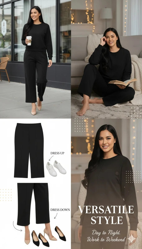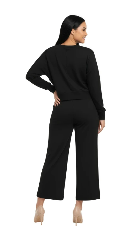 Complementing the top are the chic wide-leg trousers, which offer a comfortable and contemporary silhouette. These pants are designed to provide ease of movement while maintaining a fashionable aesthetic. They feature similar subtle seam detailing that aligns perfectly with the top, creating a cohesive and harmonious outfit. The wide-leg cut is both on-trend and incredibly comfortable, allowing for a relaxed fit through the hip and thigh, flaring gently down to the ankle.