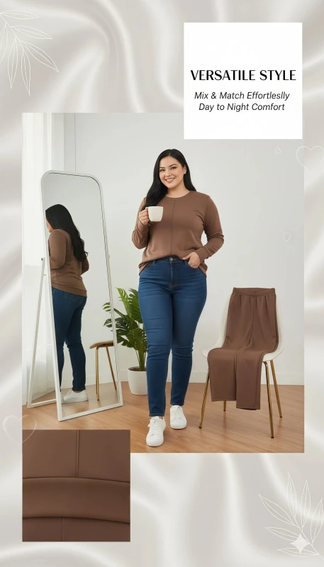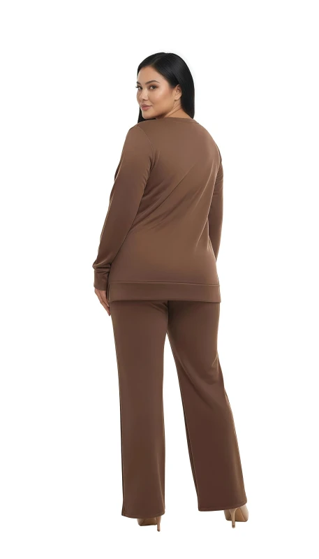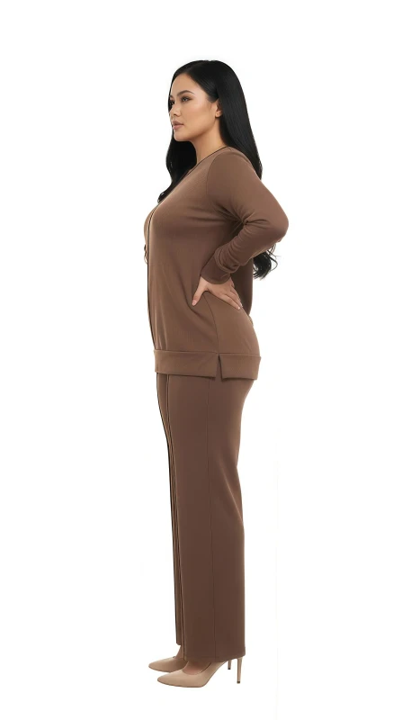 Complementing the top are the chic wide-leg trousers, which offer a comfortable and contemporary silhouette. These pants are designed to provide ease of movement while maintaining a fashionable aesthetic. They feature similar subtle seam detailing that aligns perfectly with the top, creating a cohesive and harmonious outfit. The wide-leg cut is both on-trend and incredibly comfortable, allowing for a relaxed fit through the hip and thigh, flaring gently down to the ankle.