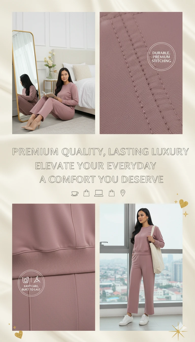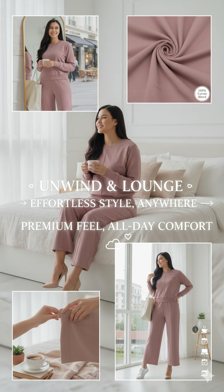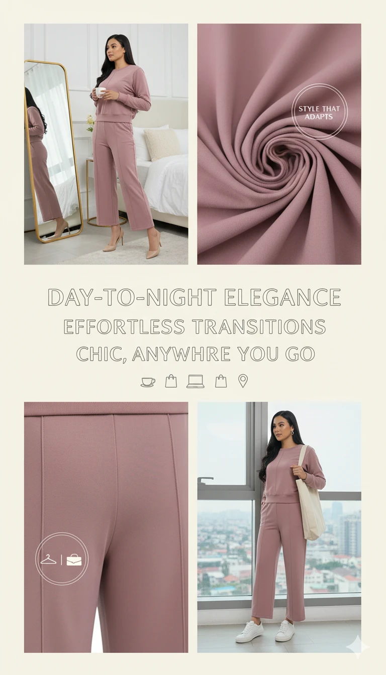 This set is perfect for a range of occasions, from a relaxed day out to a more dressed-up event. Pair it with heels for an elevated look, or style it with sneakers for a casual yet refined ensemble. Its cohesive design makes it an excellent choice for those seeking a complete, put-together outfit with minimal effort. The dusty rose color is both timeless and versatile, easily paired with a variety of accessories and outer layers.