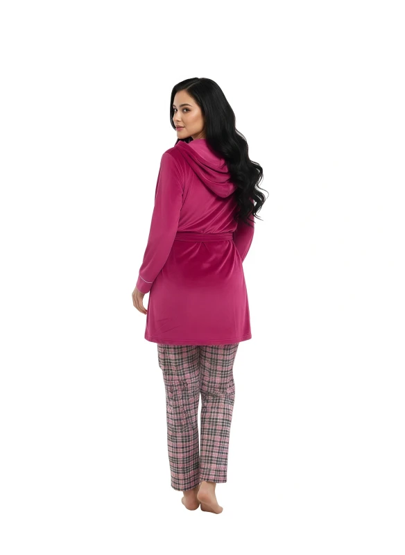 Completing this cozy trio are the comfortable pajama bottoms, featuring a playful and timeless plaid pattern. The plaid incorporates harmonious shades of pink and white, echoing the fuchsia of the top pieces while introducing a touch of visual interest. These bottoms are designed with a relaxed fit, ensuring unrestricted movement and ultimate ease, whether you're unwinding on the sofa, enjoying a leisurely breakfast, or drifting off to sleep.