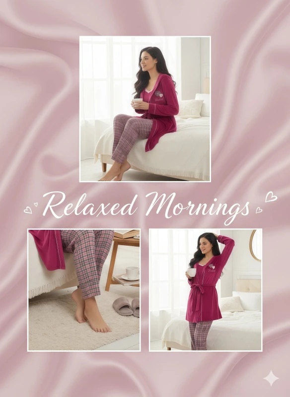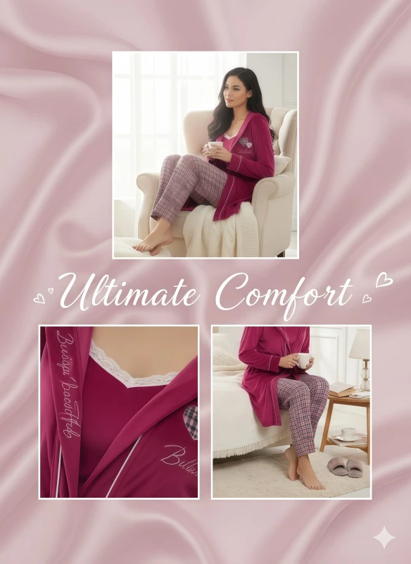 The model in the image beautifully showcases the set, exuding comfort and confidence. Her long, dark hair cascades gracefully, complementing the vibrant fuchsia, and her serene expression highlights the inviting appeal of the loungewear. This set is not just sleepwear; it's an invitation to embrace comfort, warmth, and a touch of playful elegance in your everyday downtime. Perfect for gifting or treating yourself, this 3-piece set is a versatile addition to any loungewear collection, promising sweet dreams and stylish relaxation.
