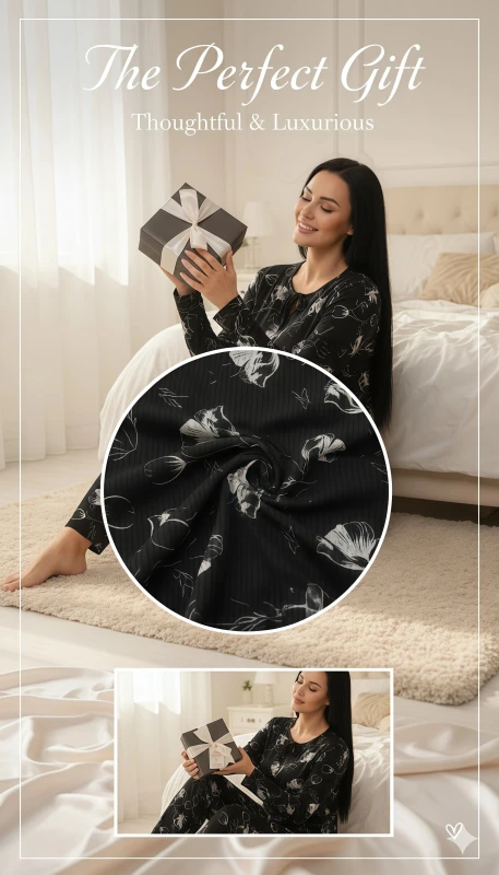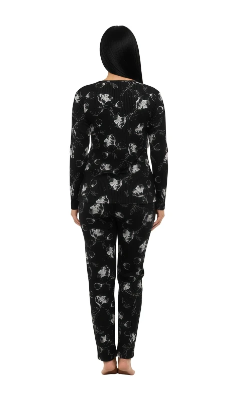 Women's Soft Ribbed Nightwear with Botanical Print - Black