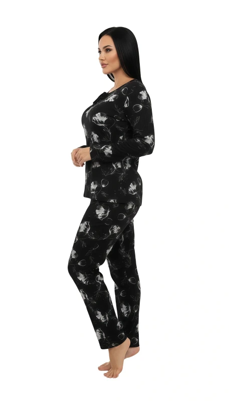 Completing this stunning ensemble are the matching long pajama pants. Designed for maximum comfort and ease of movement, the pants feature the same captivating monochrome floral pattern, creating a cohesive and polished head-to-toe look. The relaxed fit ensures unrestricted comfort, whether you're curling up with a book, enjoying a cup of tea, or simply drifting off to sleep. An elasticated waistband offers a secure yet gentle fit, adapting perfectly to your shape.