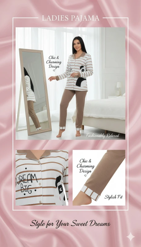 This women's pajama set offers a cozy and whimsical option for sleep or lounging. The top features a white background with thin horizontal black stripes, creating a classic yet playful look. It has a button-down front with a grey marl collar and ribbed cuffs, adding textural contrast. A charming graphic of a sleeping panda is visible on the right side of the top, peeking out from behind a handwritten-style text that reads "DREAM BIG."