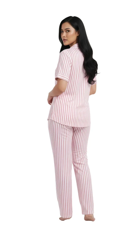 This stylish two-piece set features a crisp pattern of narrow black (or dark grey) and white vertical stripes, offering a timeless and sophisticated look. The short-sleeved top is designed with a traditional notched collar, a full button-front closure, and a playful touch of red embroidery (likely text or a small motif, given the image) on the chest pocket area, adding a hint of personality. The coordinating full-length pants provide a relaxed and comfortable fit, ensuring unrestricted movement and ultimate coziness. Crafted from a soft and breathable fabric, this pajama set is an essential addition to your loungewear collection, offering year-round comfort and elegant style.