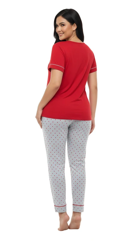 This two-piece sleepwear set features a soft navy blue short-sleeved top and coordinating full-length pants. The top boasts a classic round neckline, subtle white piping along the sleeve cuffs, and a stylish chest pocket with "LOVE" embroidered in vibrant red script, adding a sweet and heartfelt touch. The full-length pajama bottoms are adorned with an all-over pattern of tiny white polka dots, mirroring the delicate accents on the top, and feature a white piped cuff for a cohesive and polished look. Crafted from soft, breathable fabric, this pajama set is designed for ultimate comfort, making it an ideal choice for unwinding after a long day or enjoying a leisurely start to your morning.