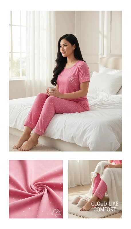 features a soft, vibrant pink short-sleeved top and matching full-length pants,