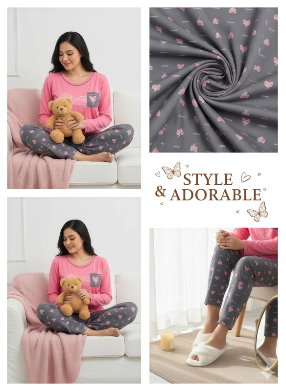 Crafted from what appears to be a soft and breathable fabric, such as cotton or a cotton blend, this set prioritizes comfort without sacrificing style. The thoughtful design, from the color blocking to the charming butterfly motifs, makes this pajama set a lovely choice for anyone seeking both coziness and a touch of feminine flair in their sleepwear.